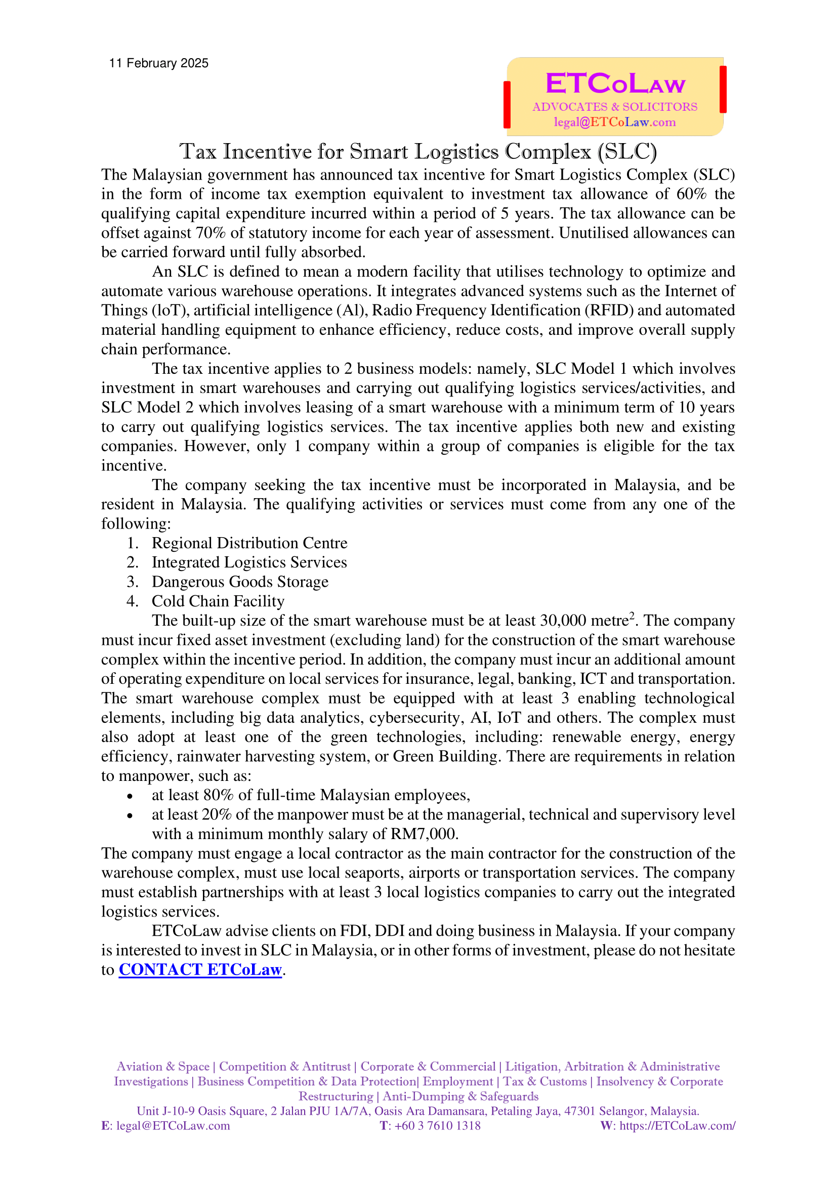 ETCoLaw advise clients on FDI, DDI and doing business in Malaysia. If your company is interested to invest in SLC in Malaysia, or in other forms of investment, please do not hesitate to CONTACT ETCoLaw.